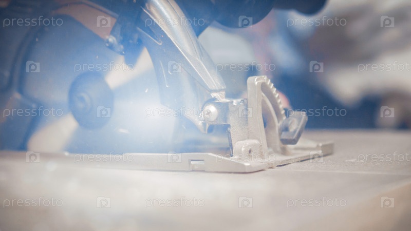 Плотник режет деревянную панель электроинструментом
