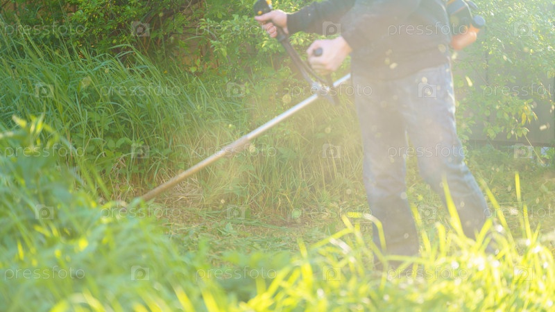 Мужчина косит траву триммером, фокусируется на размытом фоне переднего плана