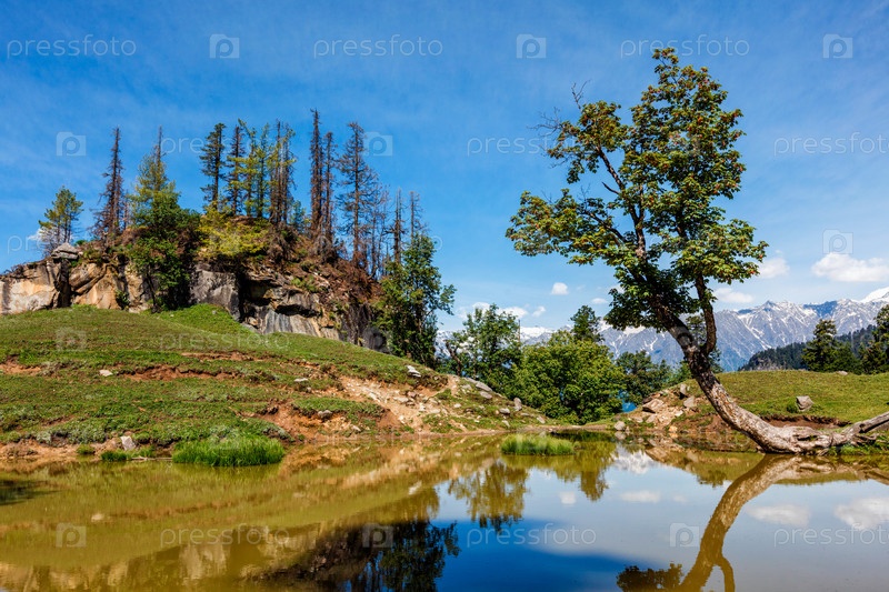 Живописный индийский гималайский пейзаж в Гималаях с деревом и небольшим озером. Химачал-Прадеш, Индия