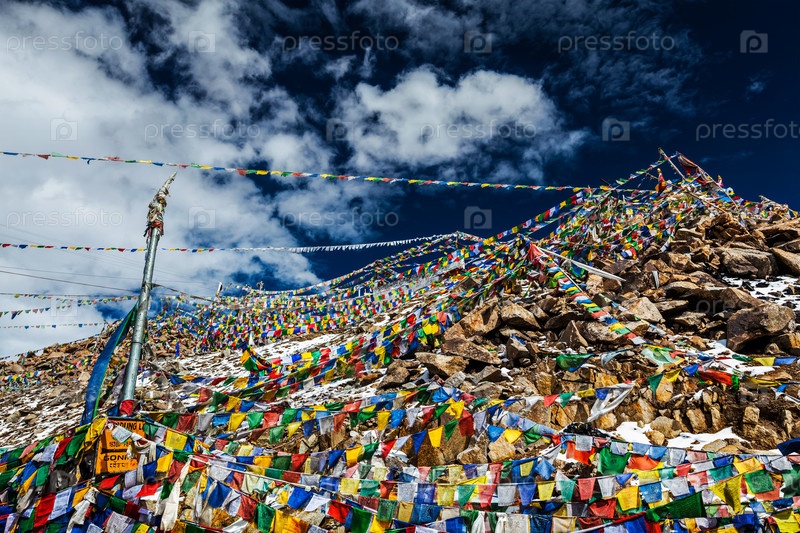 Тибетские буддийские молитвенные флаги на вершине перевала Кхардунг Ла. Самый высокий автомобильный перевал в мире 5602 м