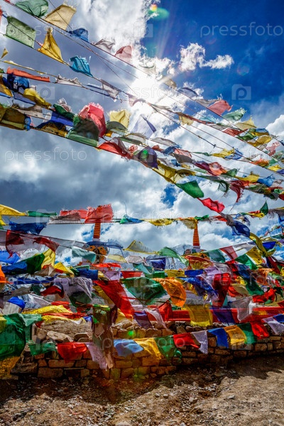 Молитвенные флаги с буддийскими мантрами на высоком перевале Кунзум Ла, Химачал-Прадеш, Индия