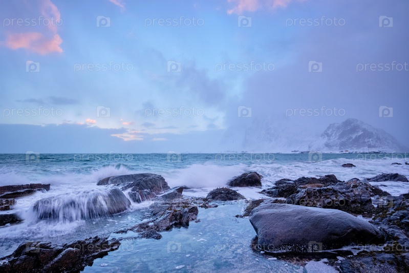 Пляж Норвежского моря на скалистом побережье фьорда на закате зимой. Пляж Варейд, Лофотенские острова, Норвегия