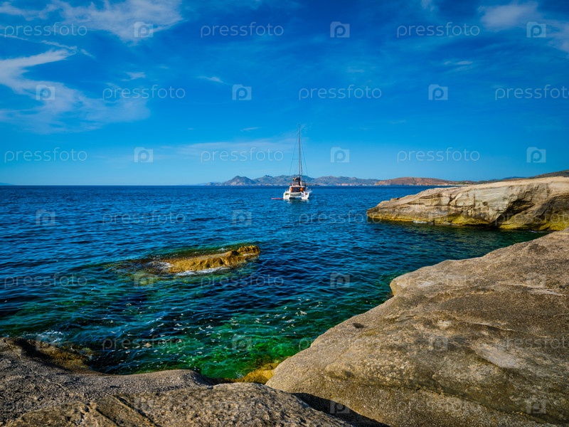 Яхта на пляже Саракинико в Эгейском море, остров Милос, Греция