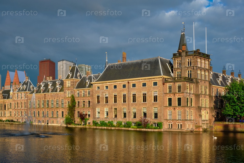 Вид на здание парламента Бинненхоф и озеро Хофвейвер на фоне небоскребов центра города. Гаага, Нидерланды