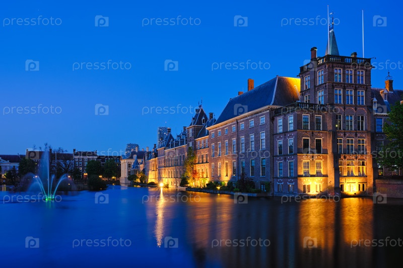 Вид на здание парламента Бинненхоф и озеро Хофвейвер с небоскребами в центре города на заднем плане, освещенными вечером. Гаага, Нидерланды