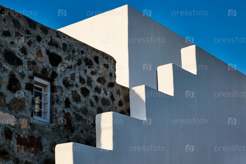 Абстрактная предпосылка греческой архитектуры - побеленный дом с лестницей и голубым небом. Остров Милос, Греция