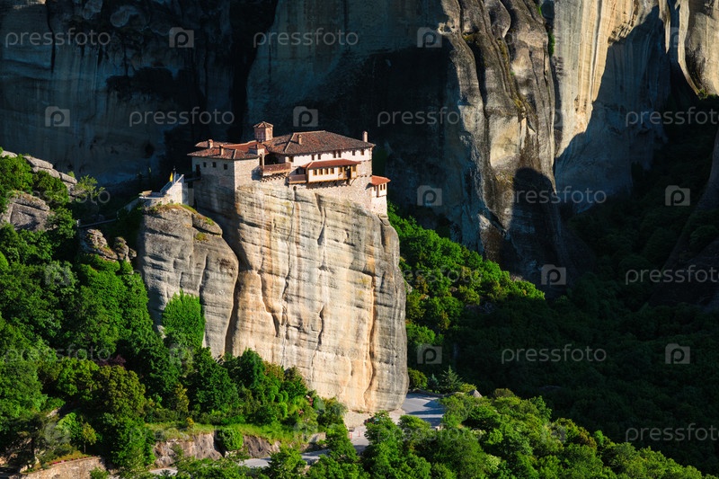 Монастырь Русану в известном греческом туристическом месте Метеоры в Греции на закате с живописным пейзажем