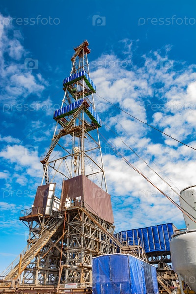 Буровая установка с башней-башней. Внизу находится буровое оборудование. На северном месторождении для добычи нефти и газа бурят глубокую скважину. Летний день. Голубое облачное небо