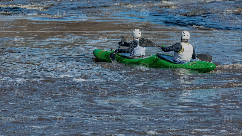 Серия изображений. Спортсмены на байдарках и байдарках покоряют бурные воды реки. Одет в водонепроницаемую одежду и шлемы. В руках они держат весло. Размытость