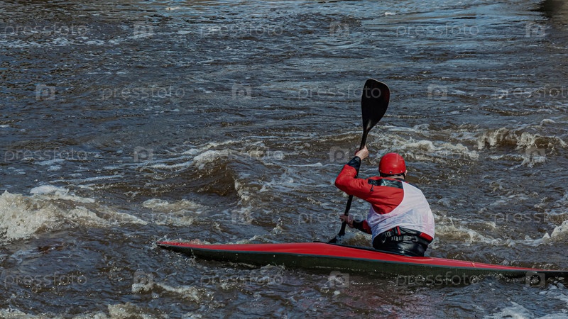 Серия изображений. Спортсмены на байдарках и байдарках покоряют бурные воды реки. Одет в водонепроницаемую одежду и шлемы. В руках они держат весло. Размытость