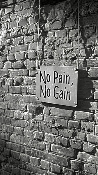 Черно-белое фото, слоган «Нет боли, нет выгоды» на кирпичной стене, вид сбоку
