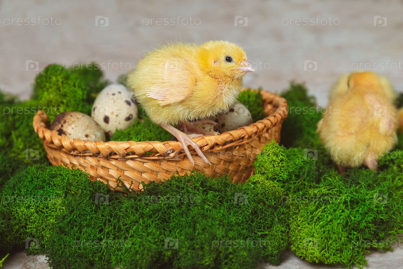Желтая перепелиная курица сидит на корзине с перепелиными яйцами и зеленым мхом на каменном фоне