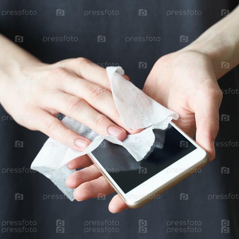 Женщина моет мобильный телефон влажными салфетоками, чтобы предотвратить заболевание новым коронавирусом 2019-nCoV после посещения общественного места