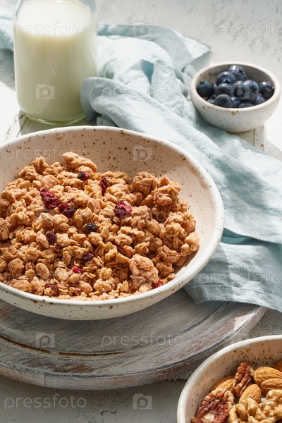 Сухая гранола в миске. Завтрак, здоровое диетическое питание с молоком в бутылке, овсяные хлопья