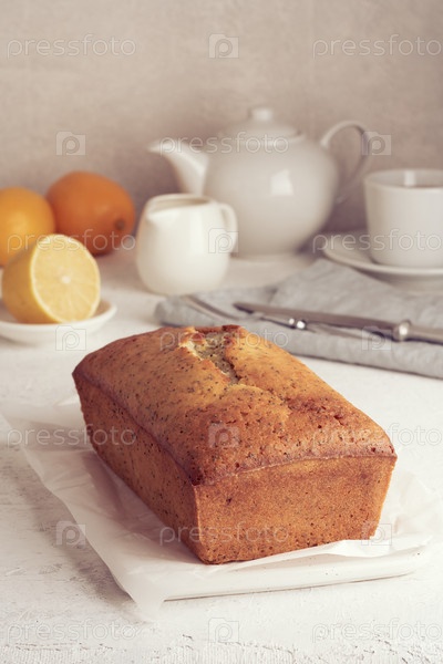 Лимонный хлеб. Торт с цитрусовыми и маком на разделочной доске, традиционная американская кухня. Целая буханка