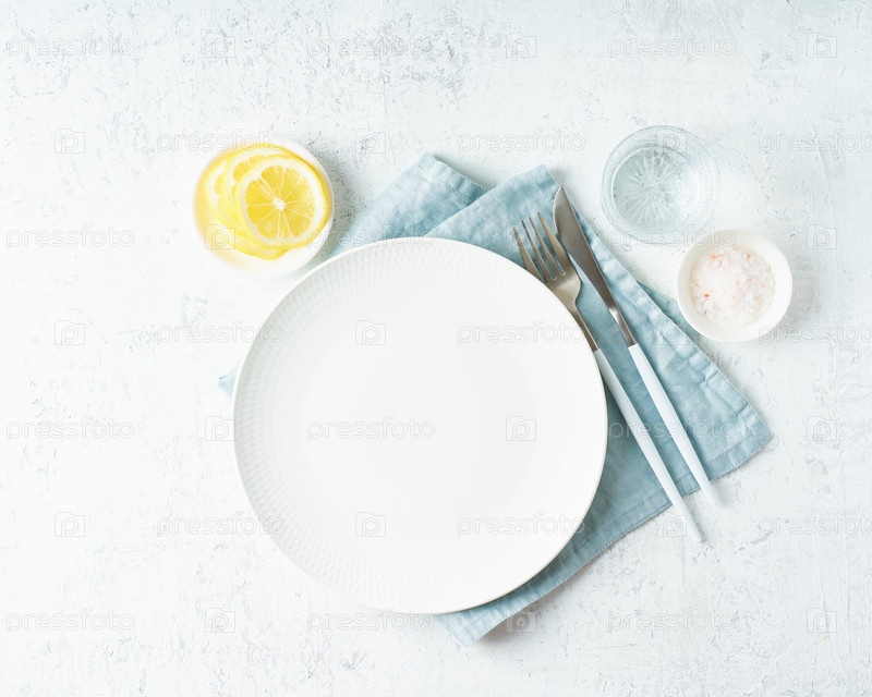 Очистите пустую белую тарелку, стакан воды, вилку и нож на белом каменном столе, пространство для копирования, макет, вид сверху. Концепция меню с посудой