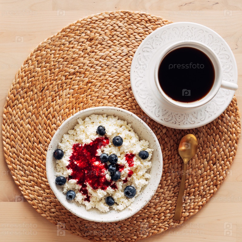 Завтрак с белой миской домашнего творога с вареньем, малиной, черникой и чашкой кофе на коричневом деревянном столе, вид сверху, крупный план
