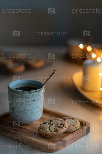 Рождественский фон с шоколадным печеньем, чашкой чая. Уютный вечер, кружка напитка, праздничные украшения, свечи и световые гирлянды. Вертикальное фото натюрморта