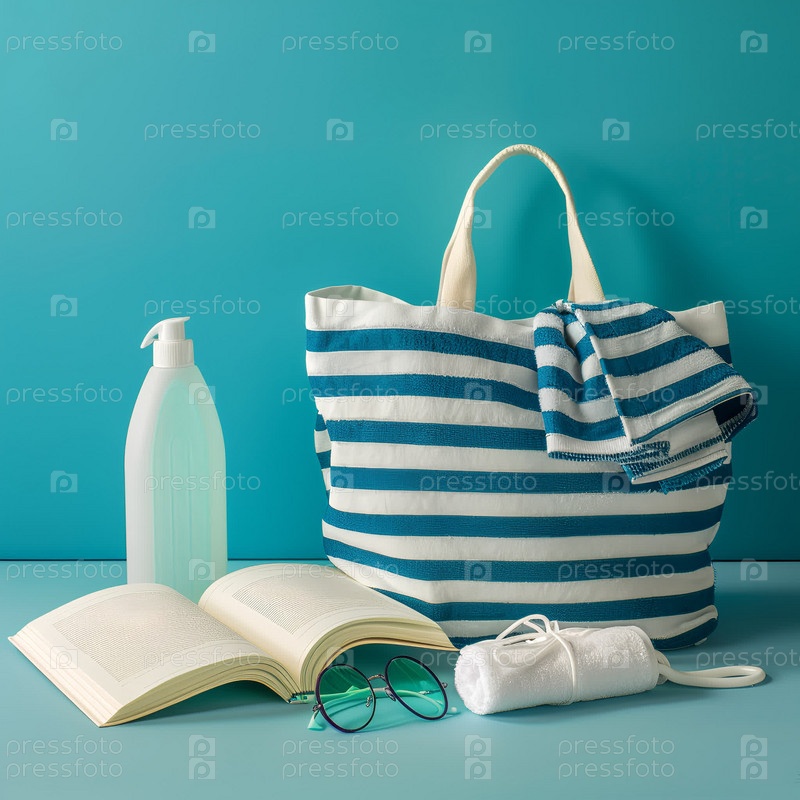 Стильная сумка со средствами по уходу за кожей и другими пляжными аксессуарами, выделяющимися на синем фоне
