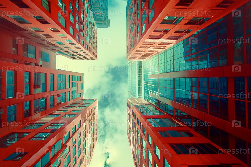 Вид снизу на огромные красные небоскребы в стиле ризографа
