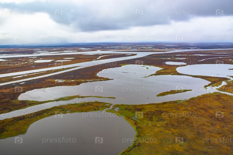 Фотосъемка с вертолета в Арктике. Осенний природный ландшафт северной тундры. Пейзаж из множества озер, рек, пестрых мхов и лишайников. Хмурое осеннее небо
