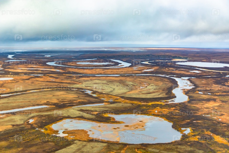 Фотосъемка с вертолета в Арктике. Осенний природный ландшафт северной тундры. Пейзаж из множества озер, рек, пестрых мхов и лишайников. Хмурое осеннее небо
