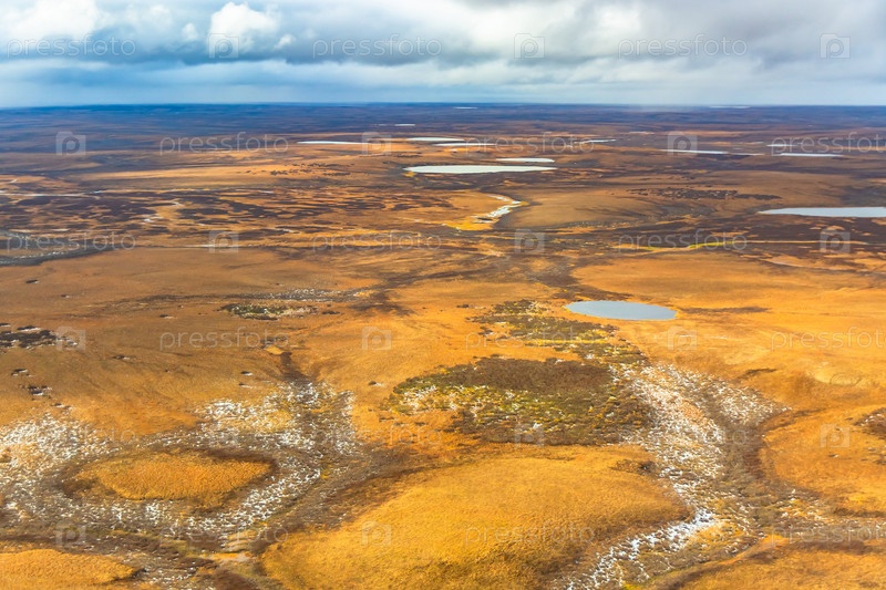 Фотосъемка с вертолета в Арктике. Осенний природный ландшафт северной тундры. Пейзаж из множества озер, рек, пестрых мхов и лишайников. В складках рельефа выпал первый снег. Хмурое осеннее небо