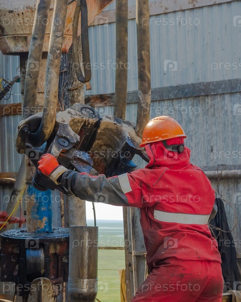 Рабочий бурильщик в красной форме, в каске и очках. Он с помощью лифта подвешивает бурильные трубы, чтобы поднять их из нефтяной скважины и продолжить ее бурение. Понятие работающего человека