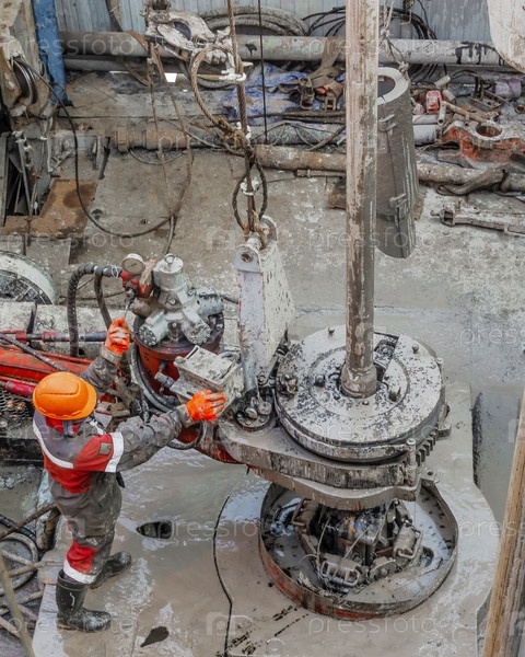 Рабочий бурильщик в красной форме, в каске и очках. Он использует гидравлический ключ, чтобы завинтить бурильные трубы, опустить их в нефтяную скважину и продолжить ее бурение. Понятие работающего человека
