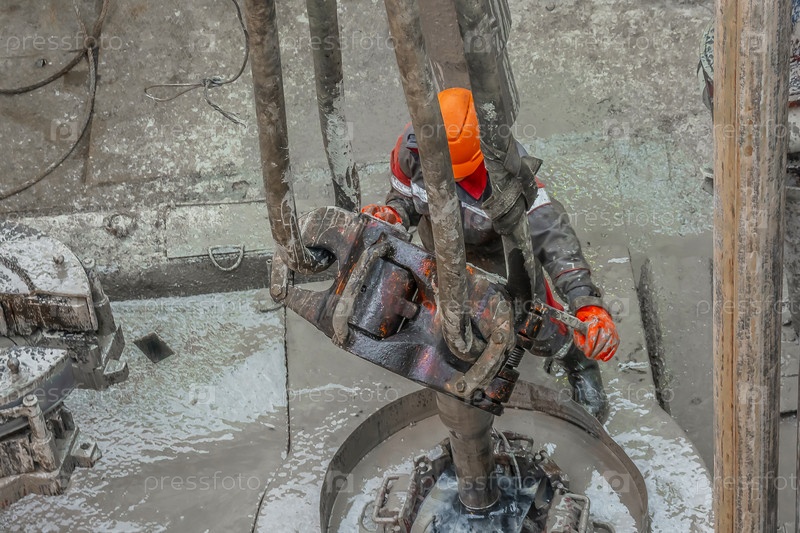 Рабочий бурильщик в красной форме, в каске и очках. Он с помощью лифта подвешивает бурильные трубы, чтобы поднять их из нефтяной скважины и продолжить ее бурение. Понятие работающего человека