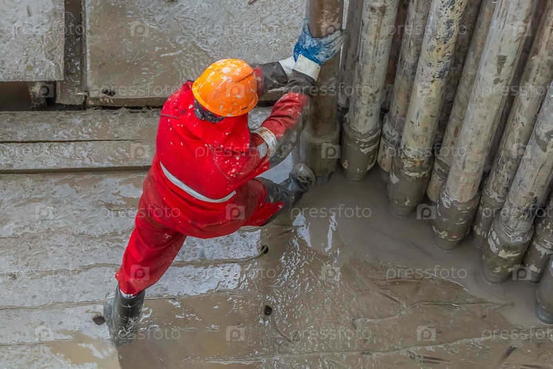 Рабочий бурильщик в красной форме, в шлеме и очках устанавливает бурильные трубы после их подъема из нефтяной скважины после бурения. Понятие работающего человека