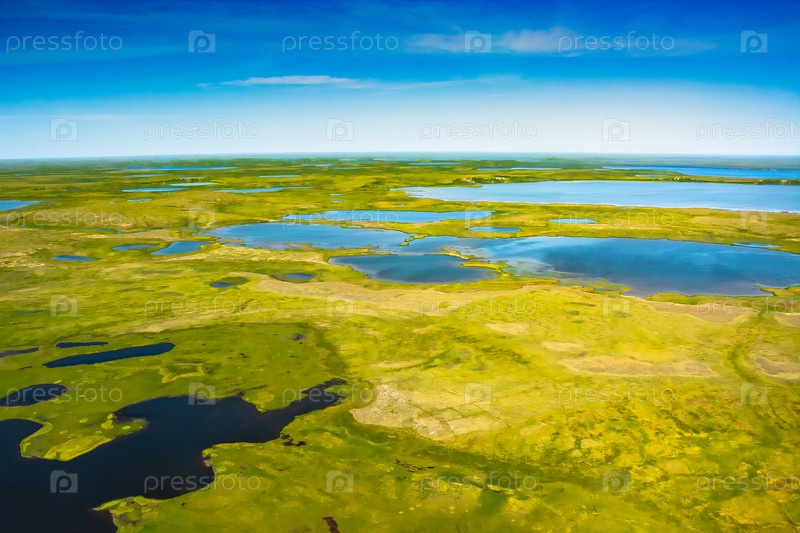 Пейзаж арктической тундры летом. Реки, озера, северная растительность. Вид сверху. Концепция изменения климата, потепление в Арктике