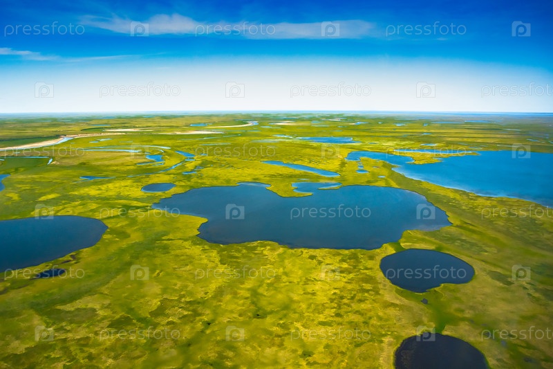Пейзаж арктической тундры летом. Реки, озера, северная растительность. Вид сверху. Концепция изменения климата, потепление в Арктике