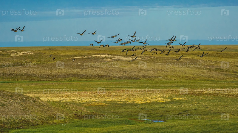 Стая диких гусей летит над северной летней тундрой на фоне голубого неба