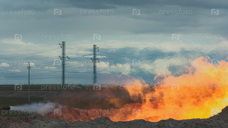 Разработка газовых скважин на Северном газовом месторождении. Сжигание загрязненного газа при забойной очистке продуктивного пласта. Приток газа из скважины под высоким давлением. Красивое оранжевое пламя