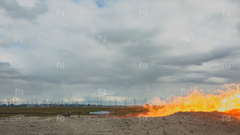 Разработка газовых скважин на Северном газовом месторождении. Сжигание загрязненного газа при забойной очистке продуктивного пласта. Приток газа из скважины под высоким давлением. Красивое оранжевое пламя