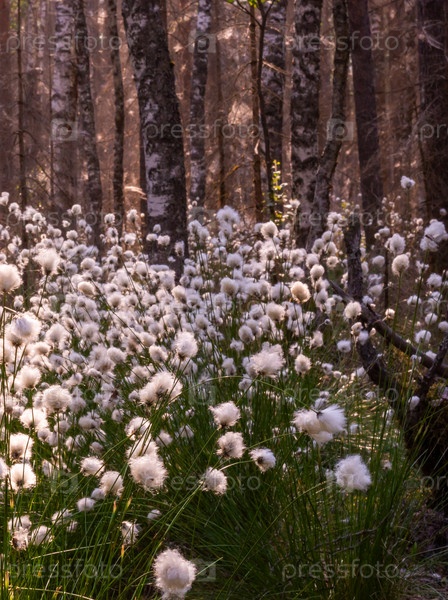 Необычные белые пушистые цветы Пушица растет в лесу на болоте.Лето.Необычное белое пушистое Плюшевые цветки растут в лесу в болотном месте.Лето
