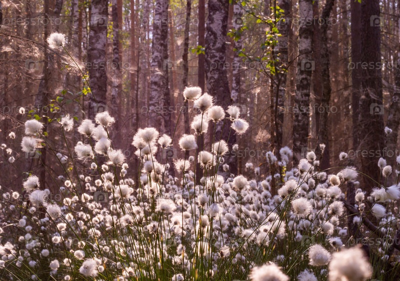 Необычные белые пушистые цветы Пушица растет в лесу на болоте.Лето.Необычное белое пушистое Плюшевые цветки растут в лесу в болотном месте.Лето