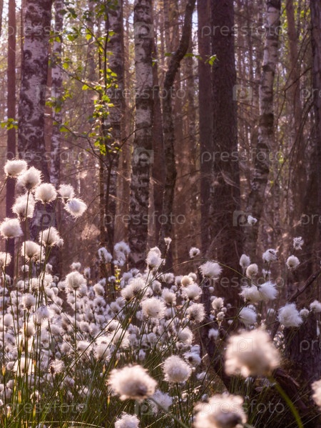 Необычные белые пушистые цветы Пушица растет в лесу на болоте.Лето.Необычное белое пушистое Плюшевые цветки растут в лесу в болотном месте.Лето