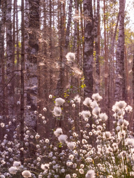 Необычные белые пушистые цветы Пушица растет в лесу на болоте.Лето.Необычное белое пушистое Плюшевые цветки растут в лесу в болотном месте.Лето