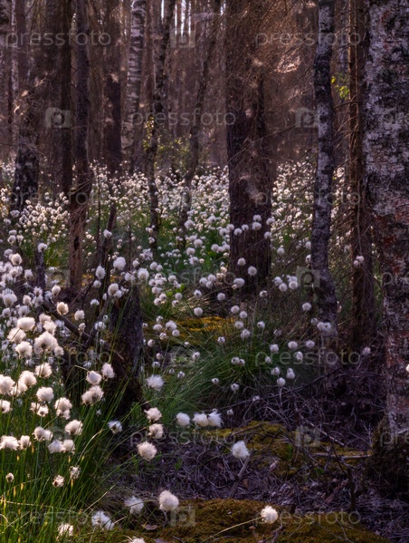 Необычные белые пушистые цветы Пушица растет в лесу на болоте.Лето.Необычное белое пушистое Плюшевые цветки растут в лесу в болотном месте.Лето