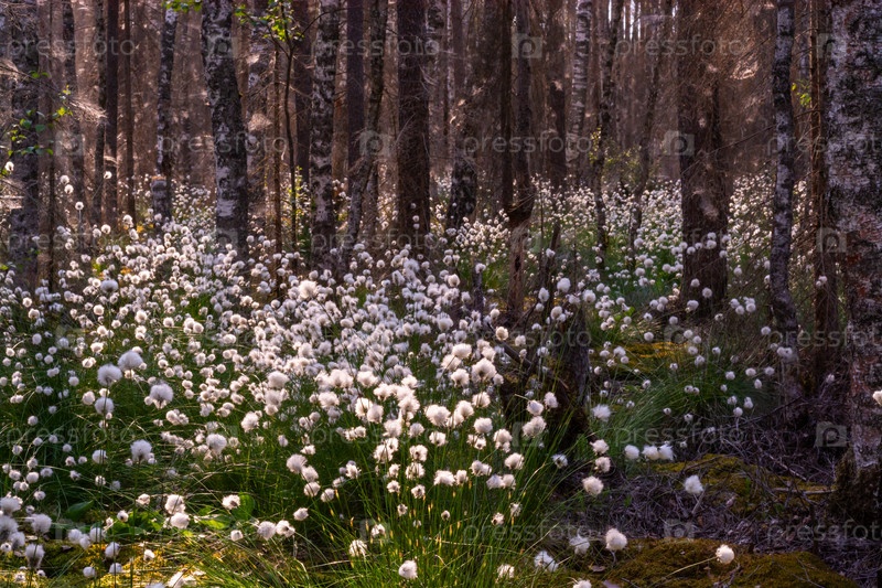 Необычные белые пушистые цветы Пушица растет в лесу на болоте.Лето.Необычное белое пушистое Плюшевые цветки растут в лесу в болотном месте.Лето