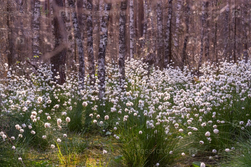Необычные белые пушистые цветы Пушица растет в лесу на болоте.Лето.Необычное белое пушистое Плюшевые цветки растут в лесу в болотном месте.Лето