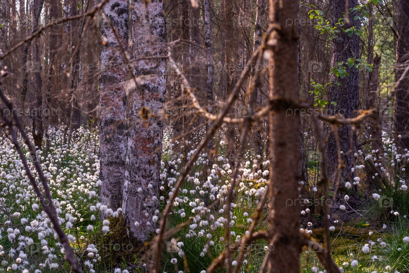 Необычные белые пушистые цветы Пушица растет в лесу на болоте.Лето.Необычное белое пушистое Плюшевые цветки растут в лесу в болотном месте.Лето