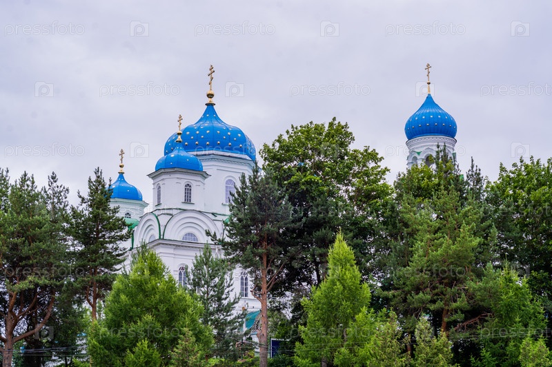 2023 год. Россия, Тверская область, город Торжок. Благовещенская церковь с небесно-голубыми куполами. Церковь на холме. Церковь Благовещения Пресвятой Богородицы. Благовещенский (Михаилоархангельский) храм. Святые места. 2023 год. Россия, Тверская область