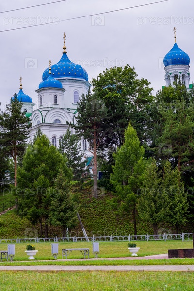 2023 год. Россия, Тверская область, город Торжок. Благовещенская церковь с небесно-голубыми куполами. Церковь на холме. Церковь Благовещения Пресвятой Богородицы. Благовещенский (Михаилоархангельский) храм. Святые места. 2023 год. Россия, Тверская область