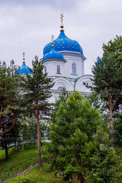 2023 год. Россия, Тверская область, город Торжок. Благовещенская церковь с небесно-голубыми куполами. Церковь на холме. Церковь Благовещения Пресвятой Богородицы. Благовещенский (Михаилоархангельский) храм. Святые места. 2023 год. Россия, Тверская область