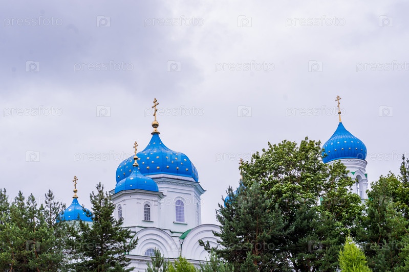 2023 год. Россия, Тверская область, город Торжок. Благовещенская церковь с небесно-голубыми куполами. Церковь на холме. Церковь Благовещения Пресвятой Богородицы. Благовещенский (Михаилоархангельский) храм. Святые места. 2023 год. Россия, Тверская область