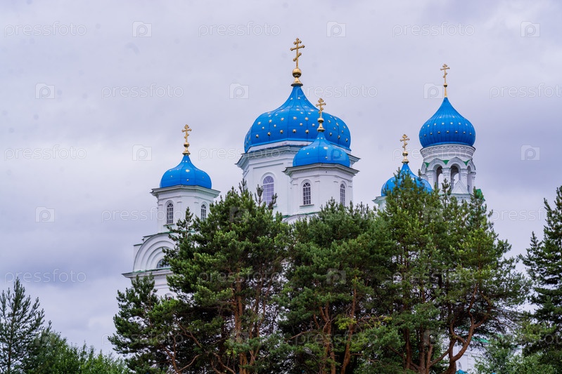 2023 год. Россия, Тверская область, город Торжок. Благовещенская церковь с небесно-голубыми куполами. Церковь на холме. Церковь Благовещения Пресвятой Богородицы. Благовещенский (Михаилоархангельский) храм. Святые места. 2023 год. Россия, Тверская область
