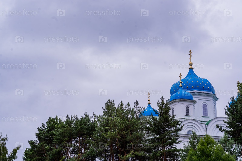 2023 год. Россия, Тверская область, город Торжок. Благовещенская церковь с небесно-голубыми куполами. Церковь на холме. Церковь Благовещения Пресвятой Богородицы. Благовещенский (Михаилоархангельский) храм. Святые места. 2023 год. Россия, Тверская область